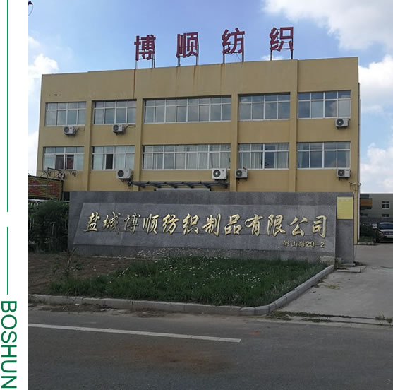 鹽城博順紡織制品有限公司座落在美麗的黃海海之濱江蘇省阜寧縣,公司鄰近204國道和新長鐵路,東臨沈海高速5公里,環境優雅,交通便利。